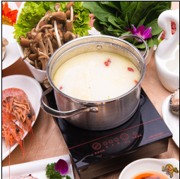 图片上展示的是半兽人火锅的三鲜汤锅。白润的汤锅中加入了枸杞,让人看着就觉得十分有营养。大虾、青菜、蘑菇等做为涮菜在一旁整齐排列,一人一锅的就餐模式时尚、个性。三线汤锅味美新鲜,清新不油腻,让顾客吃到鲜活滋味的同时更吃到营养健康。半兽人火锅具备特色口味,无明火、无油烟,好吃不上火。添加中草药配方,无有害添加剂,传承了正统老祖宗手艺,创新口味,是新派、时尚、健康的地道火锅美食。